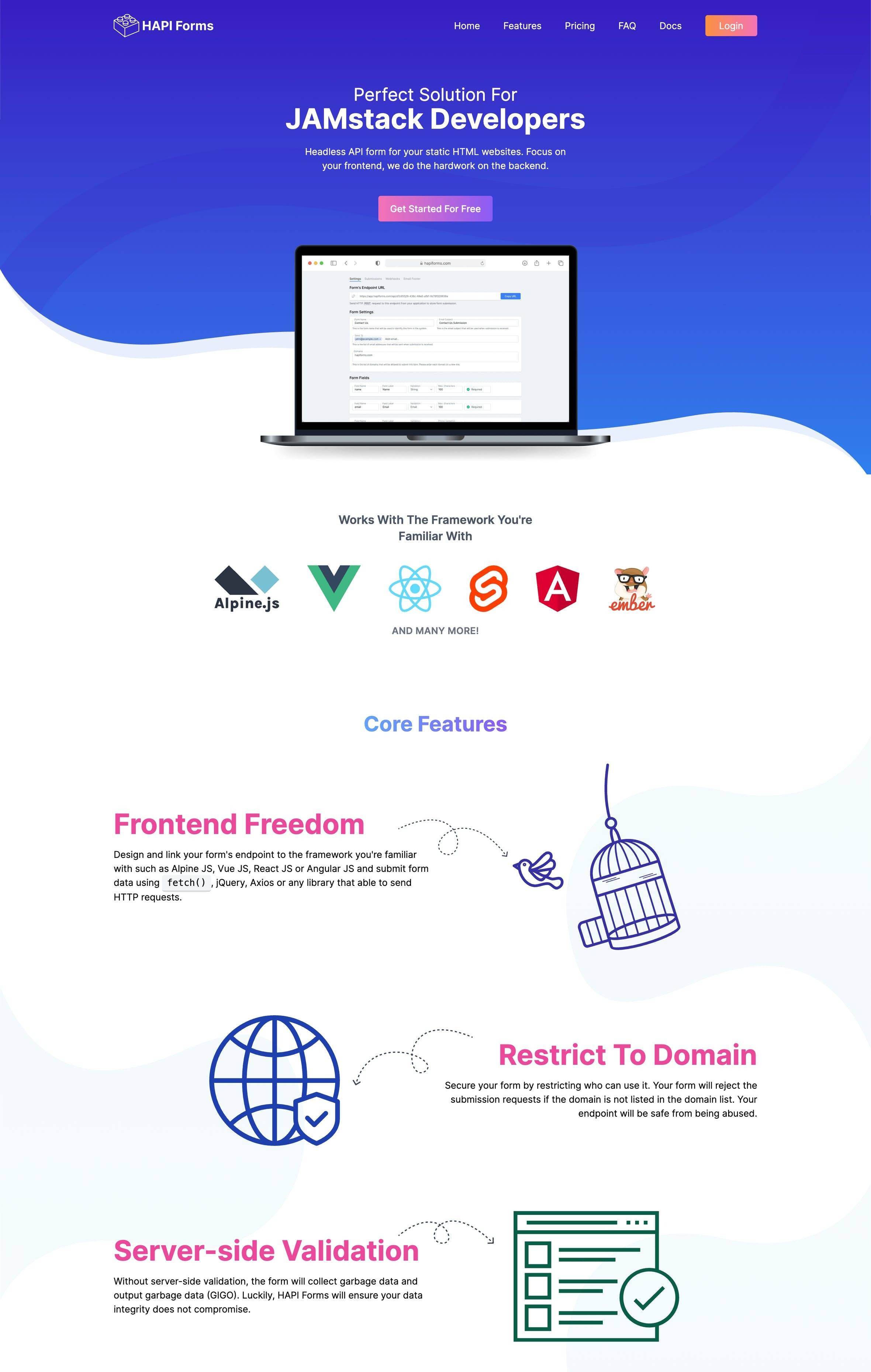 Hello there! We are proud to introduce HAPI Forms! Create a form for your static websites without building a backend. Plus, you still have full control over the frontend on how its looks and behave and works with your existing frontend framework. Batteries included!